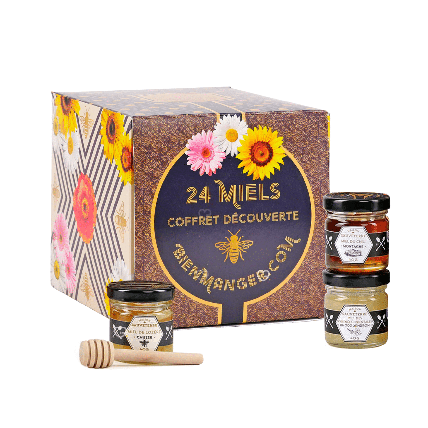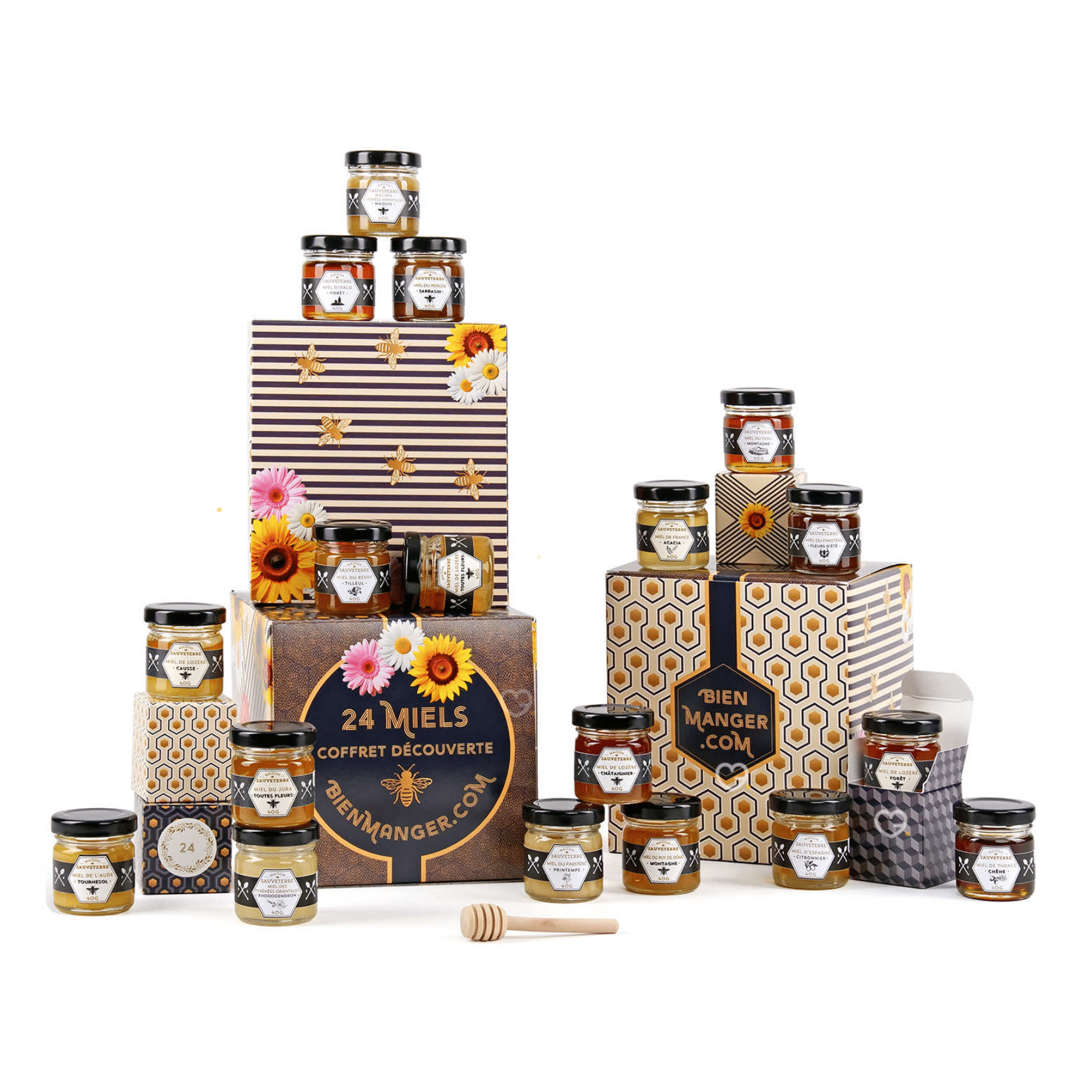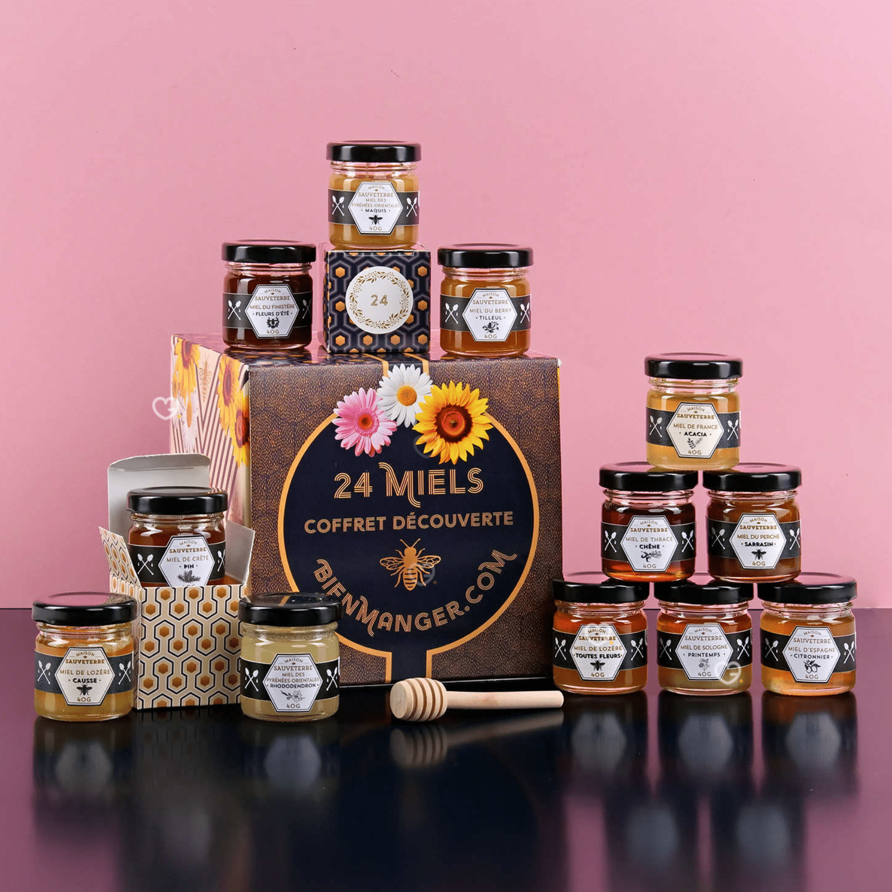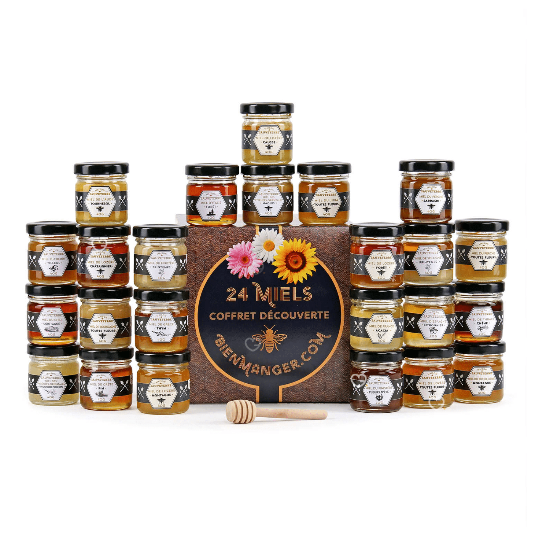 • 🍯 Découvrez 24 variétés de miel artisanal dans des pots en verre de 40g