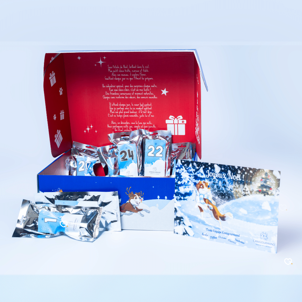 Offrez à votre fidèle compagnon la magie des fêtes avec le Calendrier de l'Avent CaniGourmand 2025, spécialement conçu pour inclure votre chien dans la tradition familiale du compte à rebours jusqu'à Noël. Ce calendrier unique renferme 24 friandises naturelles aux saveurs exceptionnelles, élaborées par nos 6 experts en nutrition canine avec des protéines premium incluant sanglier, chevreuil et lapin. Chaque case révèle une surprise 100% naturelle sans céréales, conservateurs ou additifs artificiels, garantissant à votre chien une expérience gustative variée et saine tout au long du mois de décembre. Transformez l'attente de Noël en moments de complicité quotidiens avec des friandises artisanales françaises qui allient plaisir gourmand et bien-être nutritionnel.