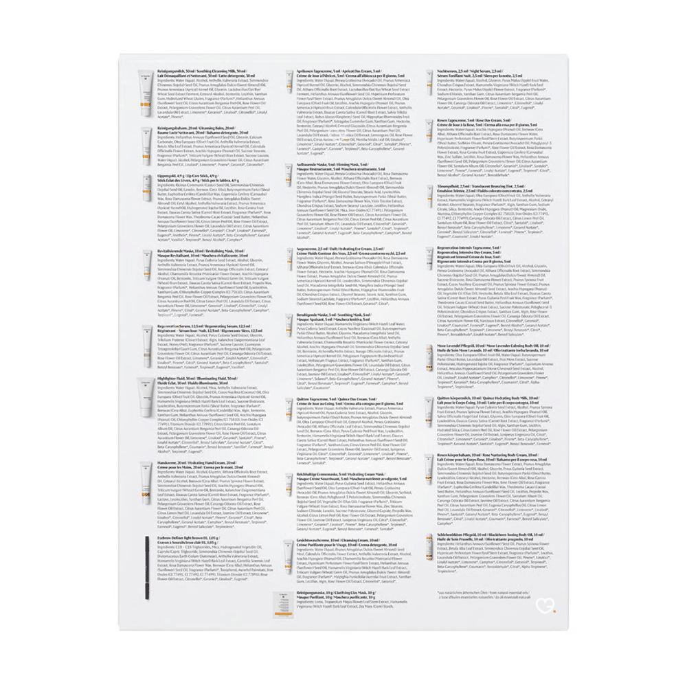 • Composition produits : 16 produits de soin visage, 6 produits de soin corps et mains, 2 produits de maquillage