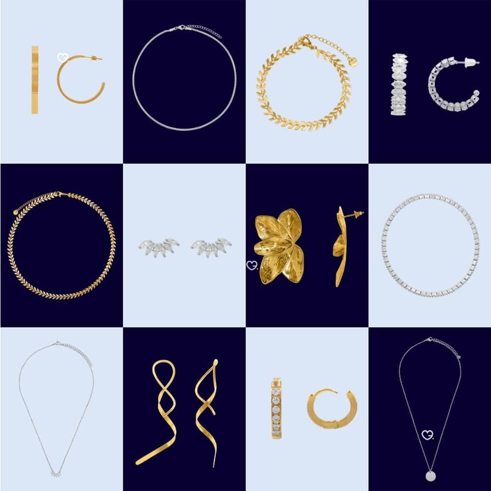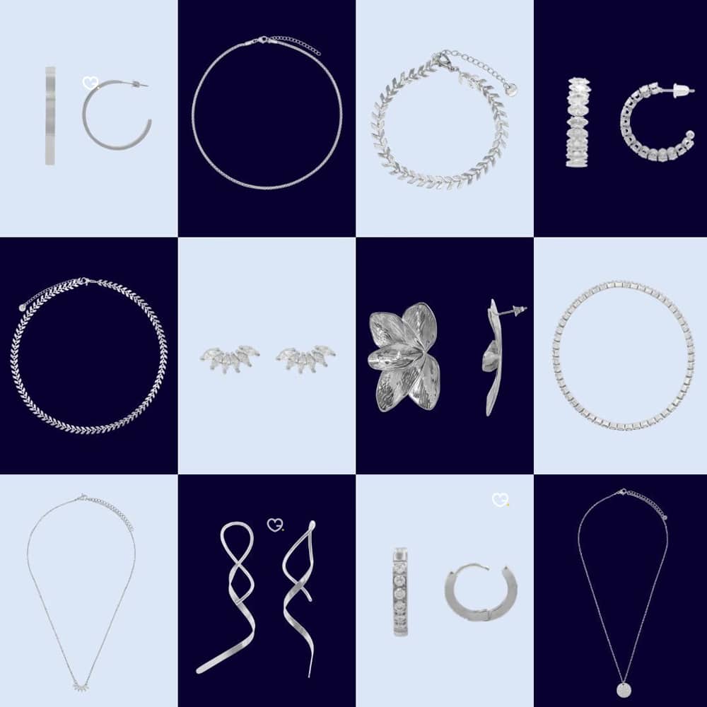 • Composition : 5 colliers/chaînes, 5 bracelets, 3 bagues ajustables, 11 paires de boucles d'oreilles