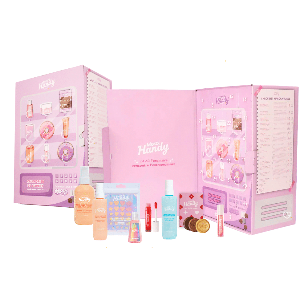 Découvrez le Calendrier de l'Avent Merci Handy 2025 Beauty & Chocolate Edition, une expérience unique qui révolutionne le compte à rebours des fêtes en combinant beauté et gourmandise artisanale. Cette édition limitée contient 24 produits en taille réelle d'une valeur totale de 145€, incluant 16 soins de beauté aux formules "clean" et parfums iconiques de Merci Handy, ainsi que 8 variétés de chocolats d'exception créés par Pascal Brunstein, Meilleur Ouvrier de France de la chocolaterie Oacao. Avec ses 5 produits exclusifs disponibles uniquement dans ce calendrier et son packaging inspiré d'un distributeur automatique 100% recyclable, cette collaboration inédite transforme chaque jour de décembre en moment de plaisir et de découverte, parfait pour se faire plaisir ou offrir à une passionnée de beauté et de saveurs raffinées.