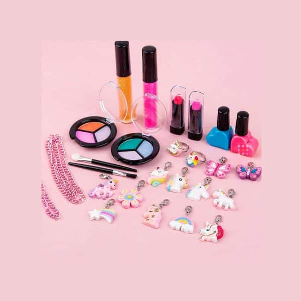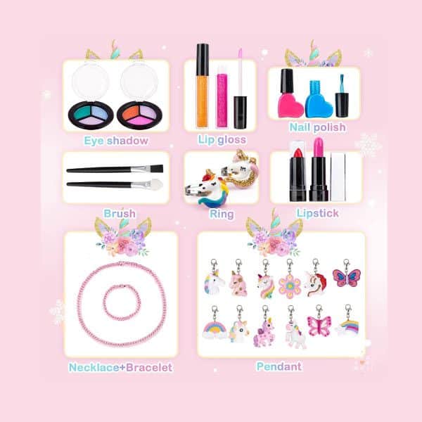 • Catégories de produits : Cosmétiques (rouge à lèvres, stylos de maquillage, blush), bijoux (pendentifs papillon, pendentifs licorne, bagues décoratives, colliers), petits accessoires décoratifs