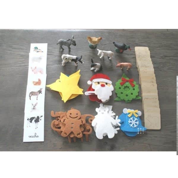 • Composants inclus : Décorations en bois, figurines éducatives, cartes d'activités, jeux interactifs en bois, livret d'instructions