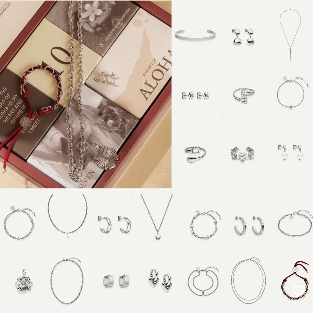 • Contenu : 25 pièces de bijoux (7 colliers, 7 paires de boucles d'oreilles, 3 bagues ajustables, 6 bracelets, 1 charm, 1 bracelet de cheville)