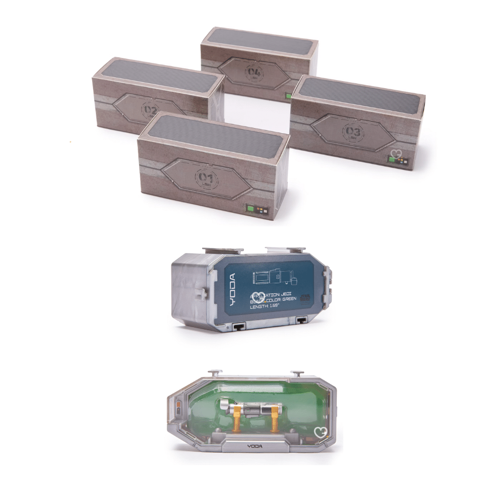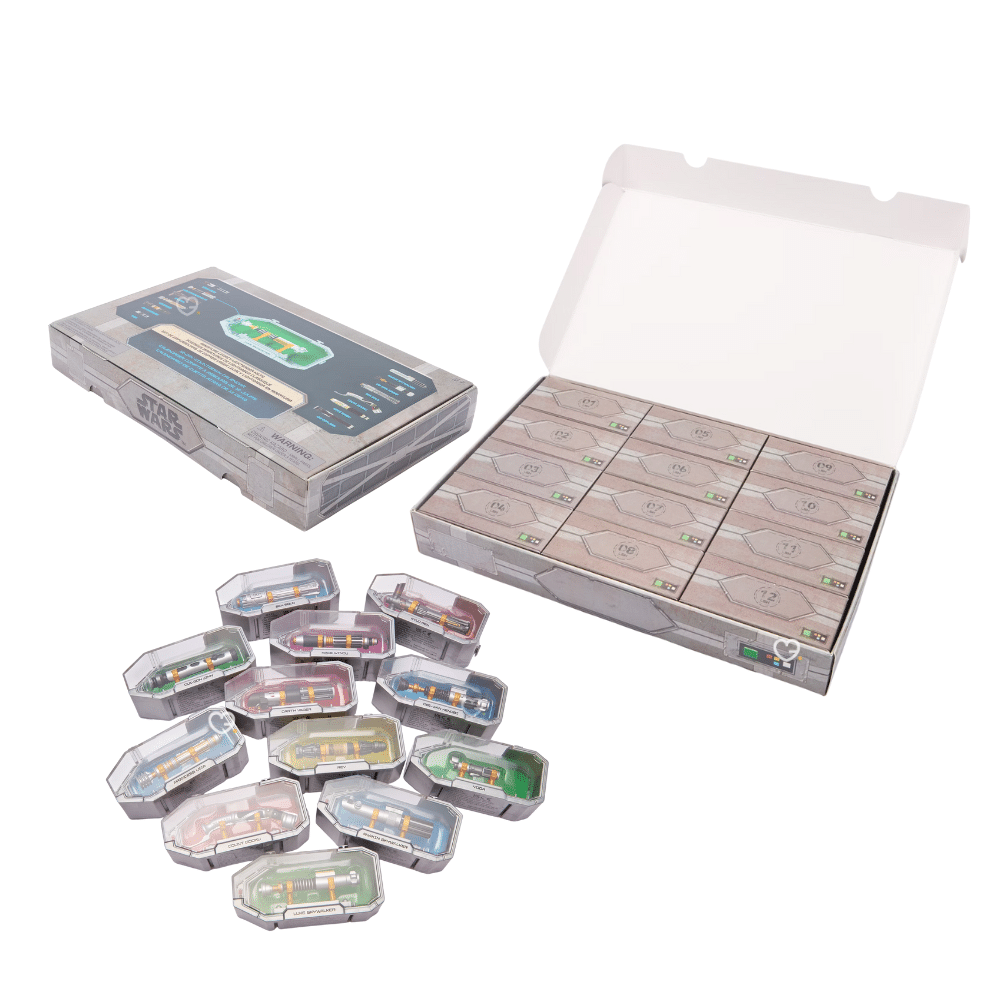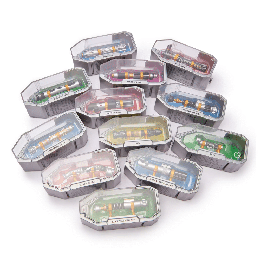 • Contenu : 12 poignées de sabres laser miniatures, 24 clips de fixation, 12 étuis de protection transparents